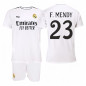 Kit infantil Real Madrid 24/25 con nombre F. Mendy y dorsal 23, incluye camiseta y pantalón oficial.
